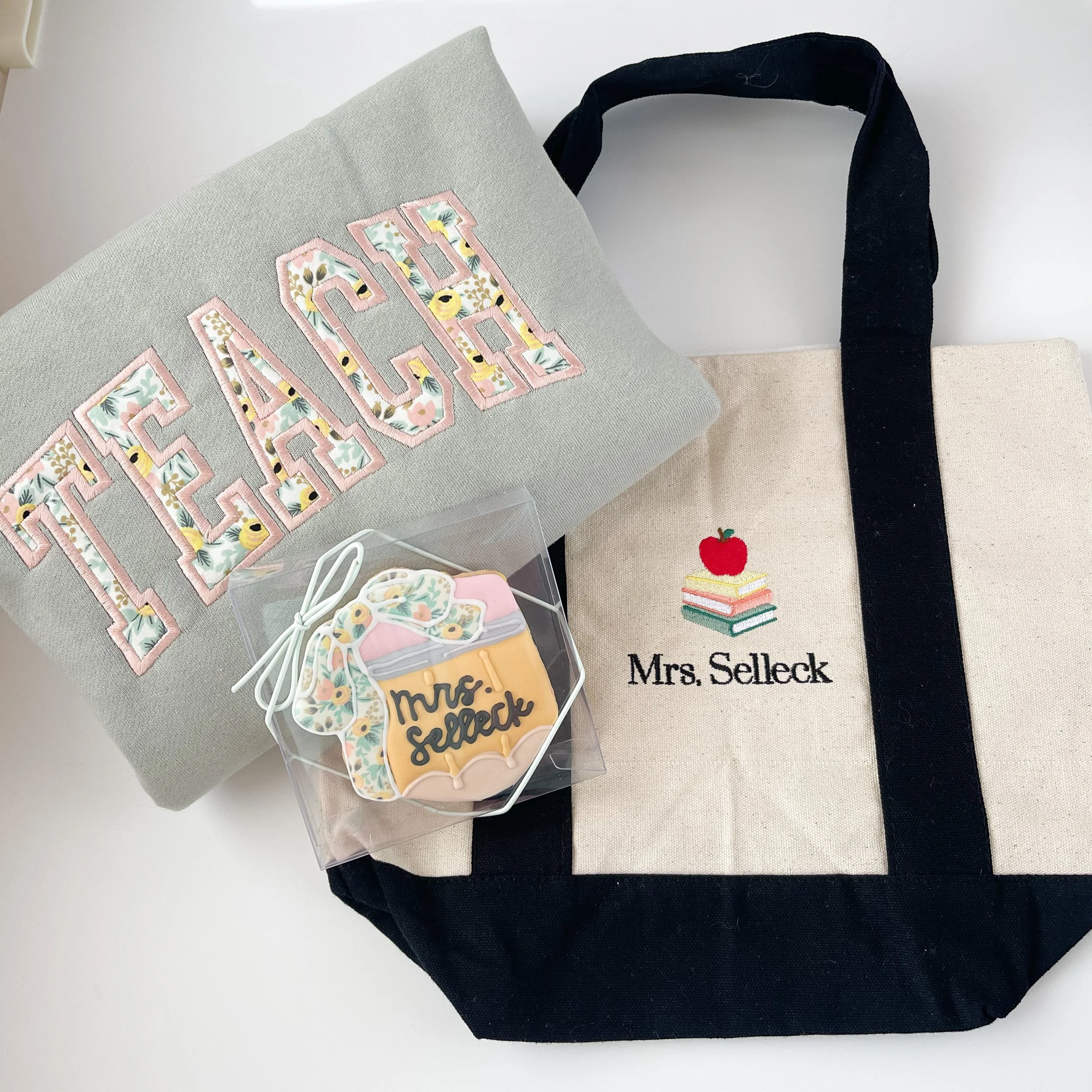 Cookie Details: We’ve partnered with Minty Apron to include a handcrafted, beautifully decorated cookie—making this gift extra special while supporting another local small business! Each cookie is thoughtfully designed to perfectly coordinate with your sweatshirt or tote bag. It comes gift-ready in a clear box with a bow, heat-sealed for freshness.