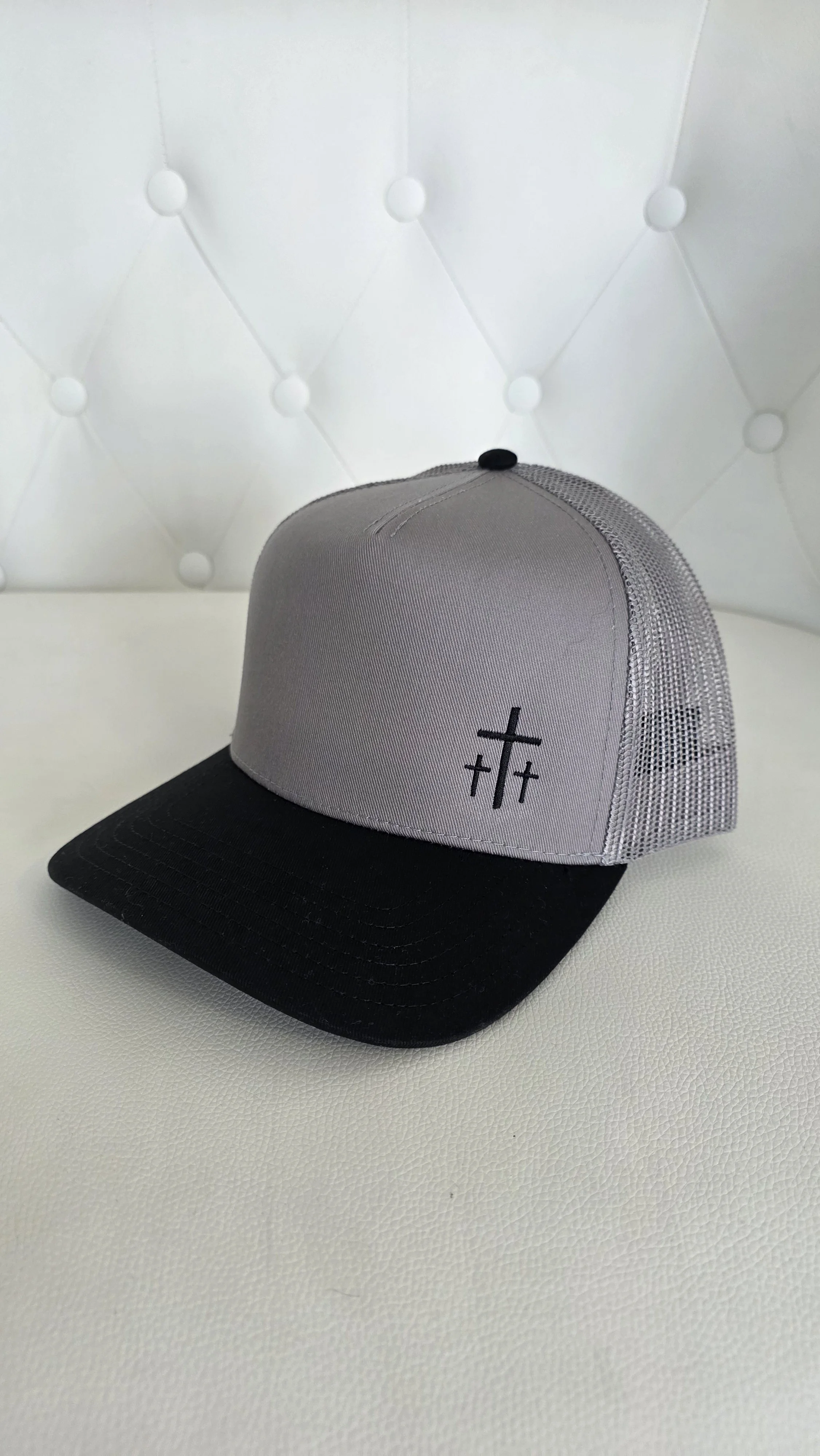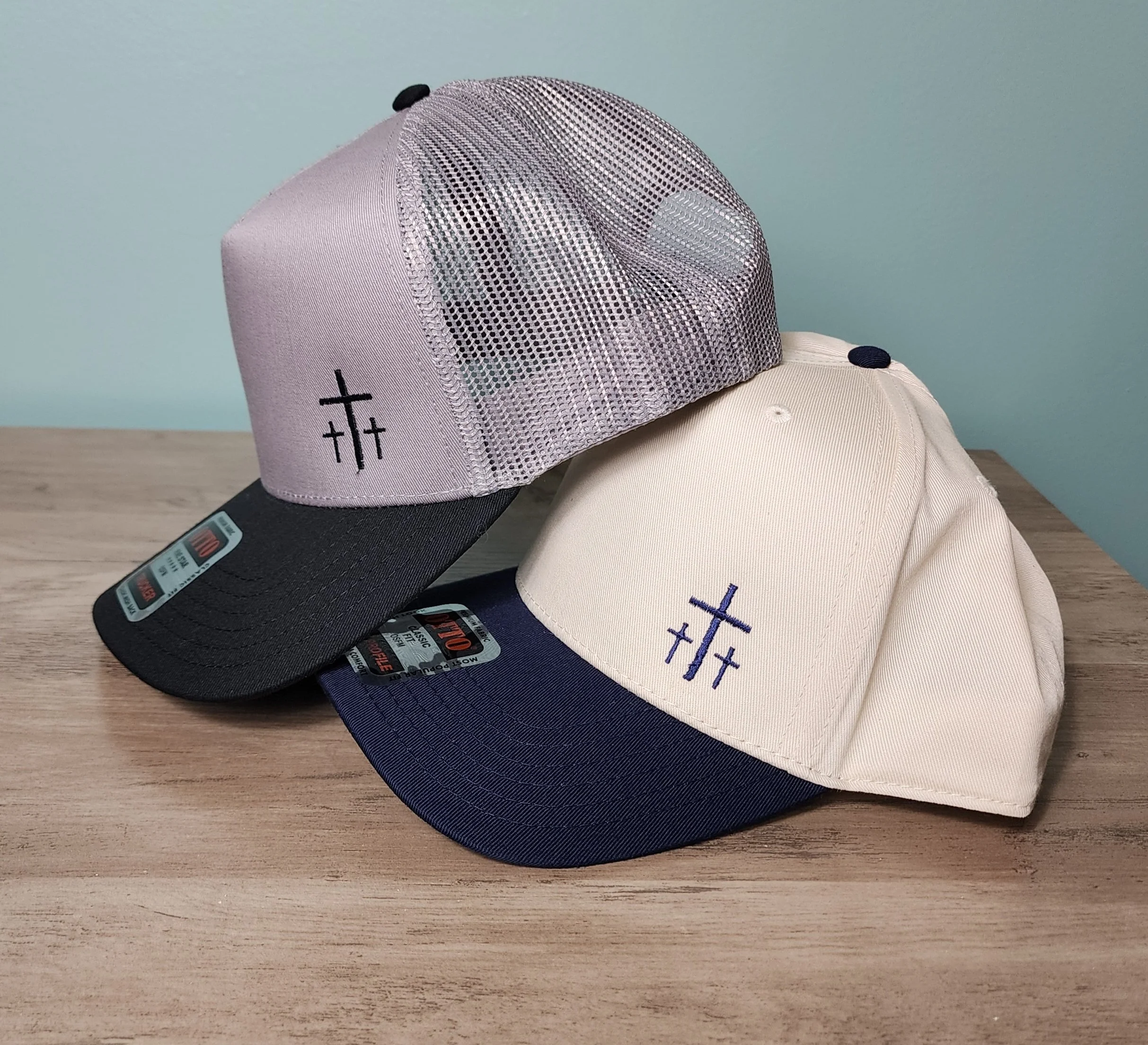 Shop › Cross Trucker Hat Image 1 of 5 Image 2 of 5 Image 3 of 5 Image 4 of 5 Image 5 of 5 Cross Trucker Hat $28.00 Cross Embroidered Trucker Hat One size fits most trucker hat. Color: Silver/Black Mesh White Camo Natural/Navy Natural/Green Add To Cart Added! Cross Embroidered Trucker Hat One size fits most trucker hat.