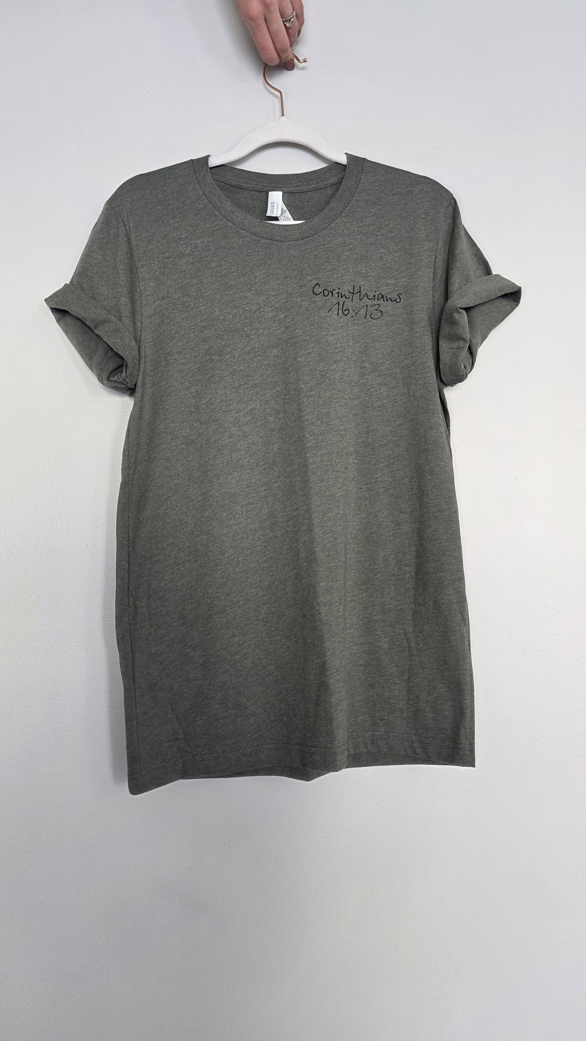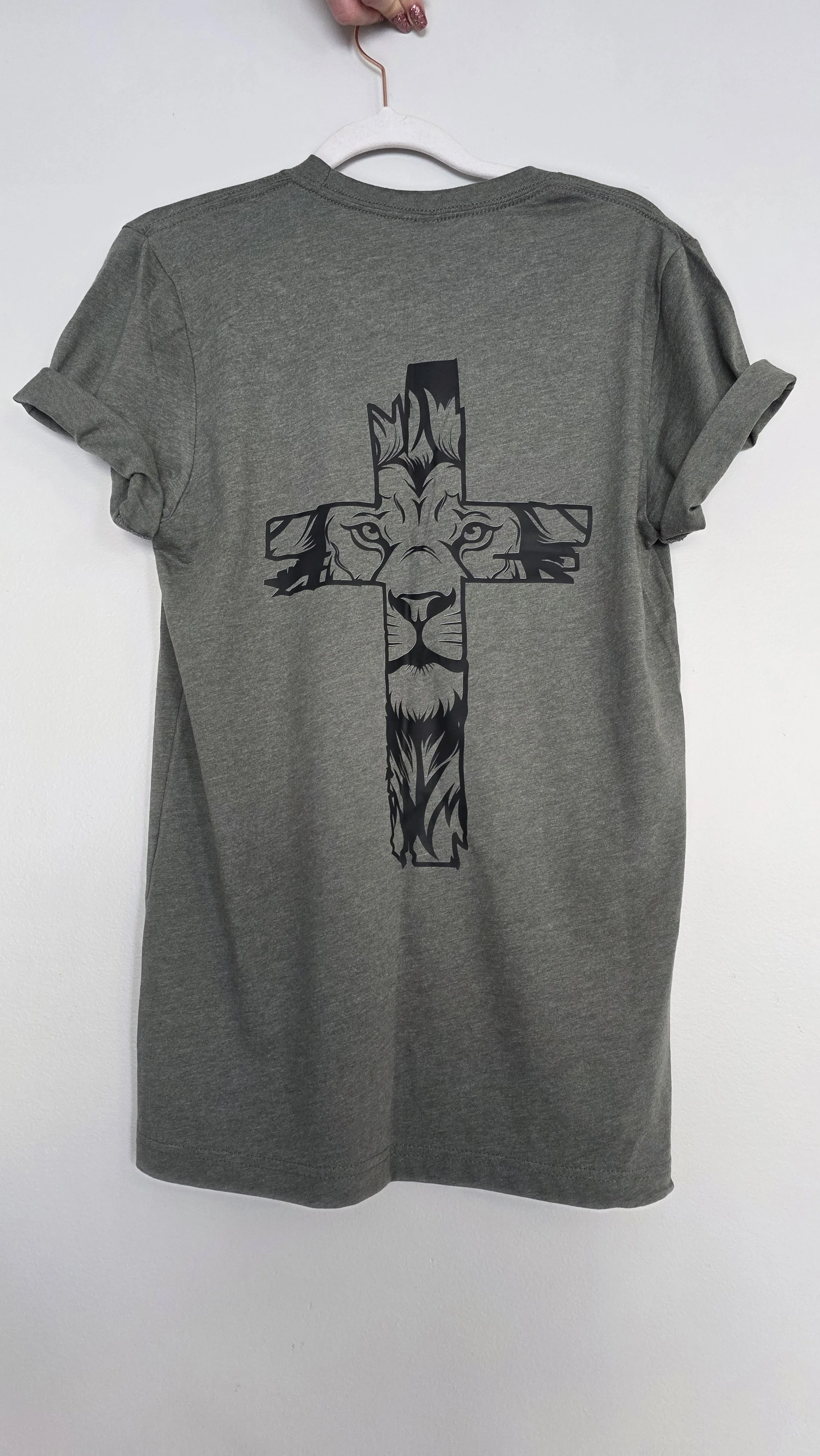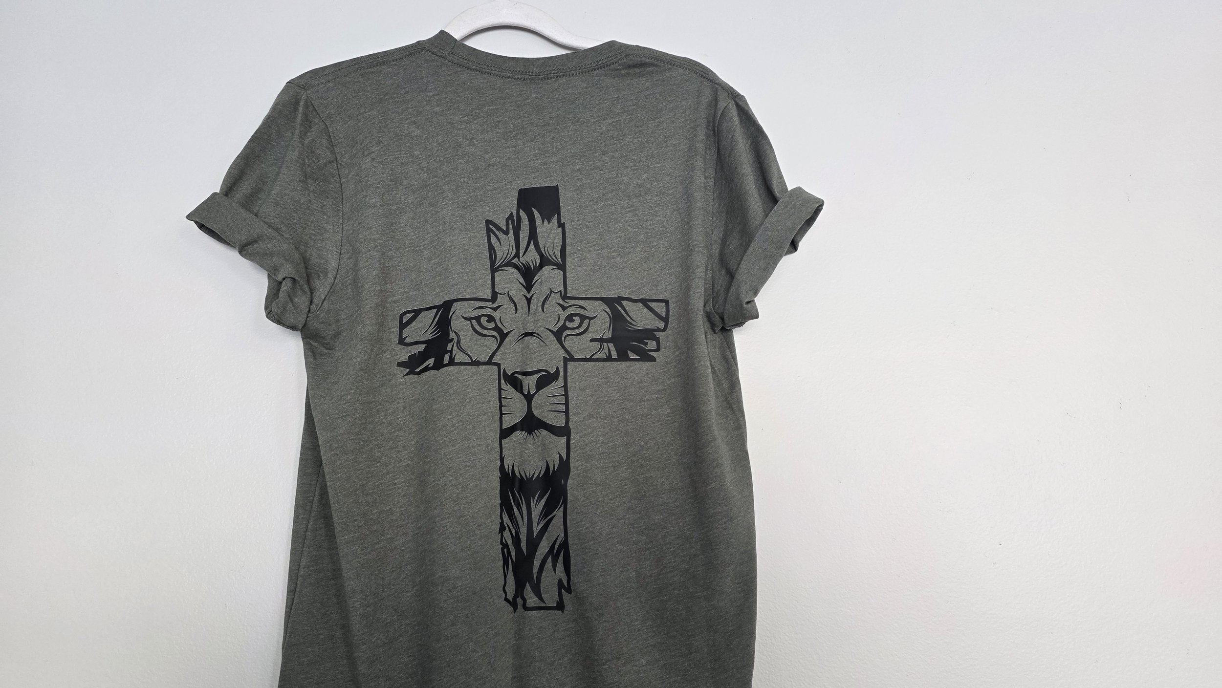 Lion of Judah screen printed graphic tee. Front of the t shirt has 1 Corinthians 16:13 on the front and a lion filled cross on the back.